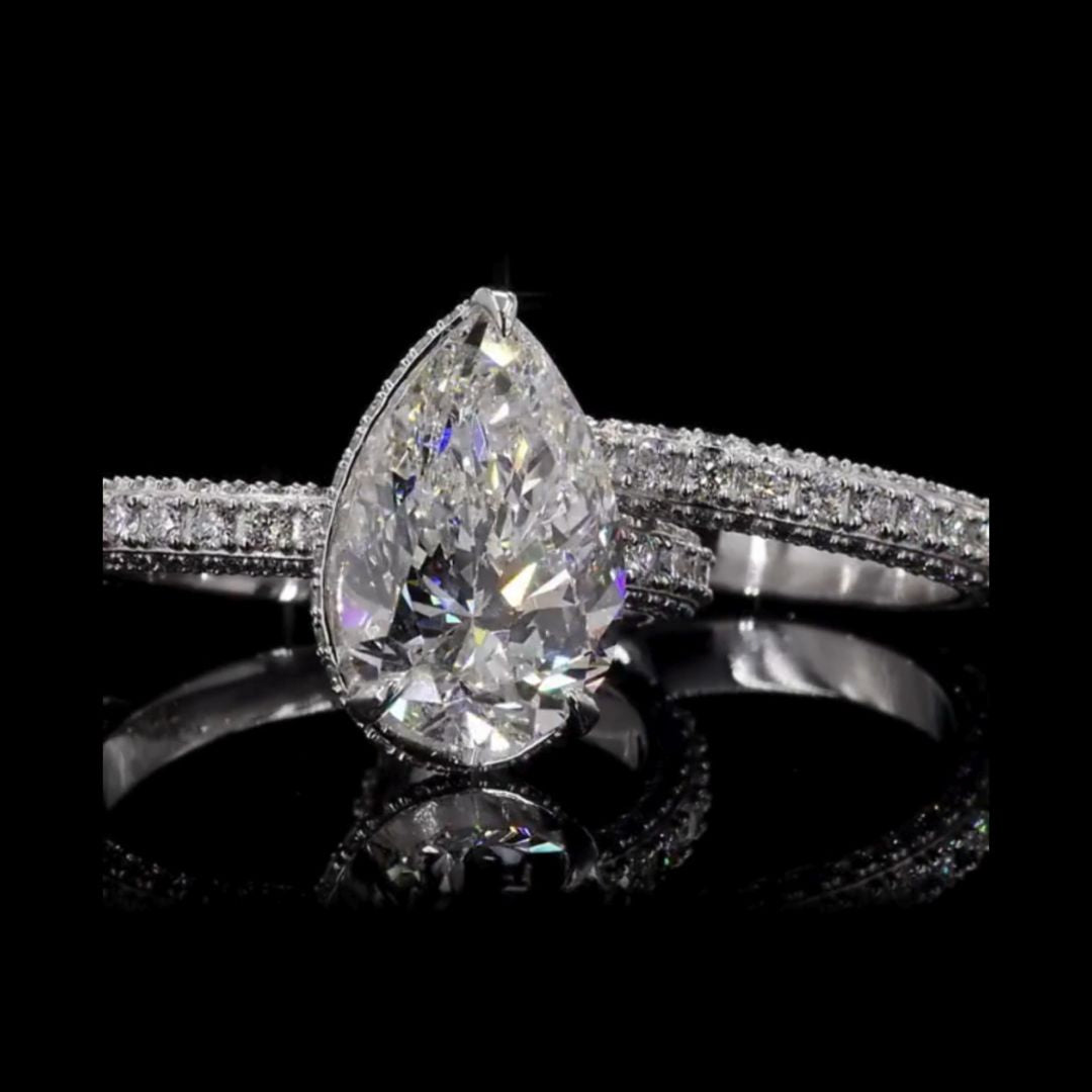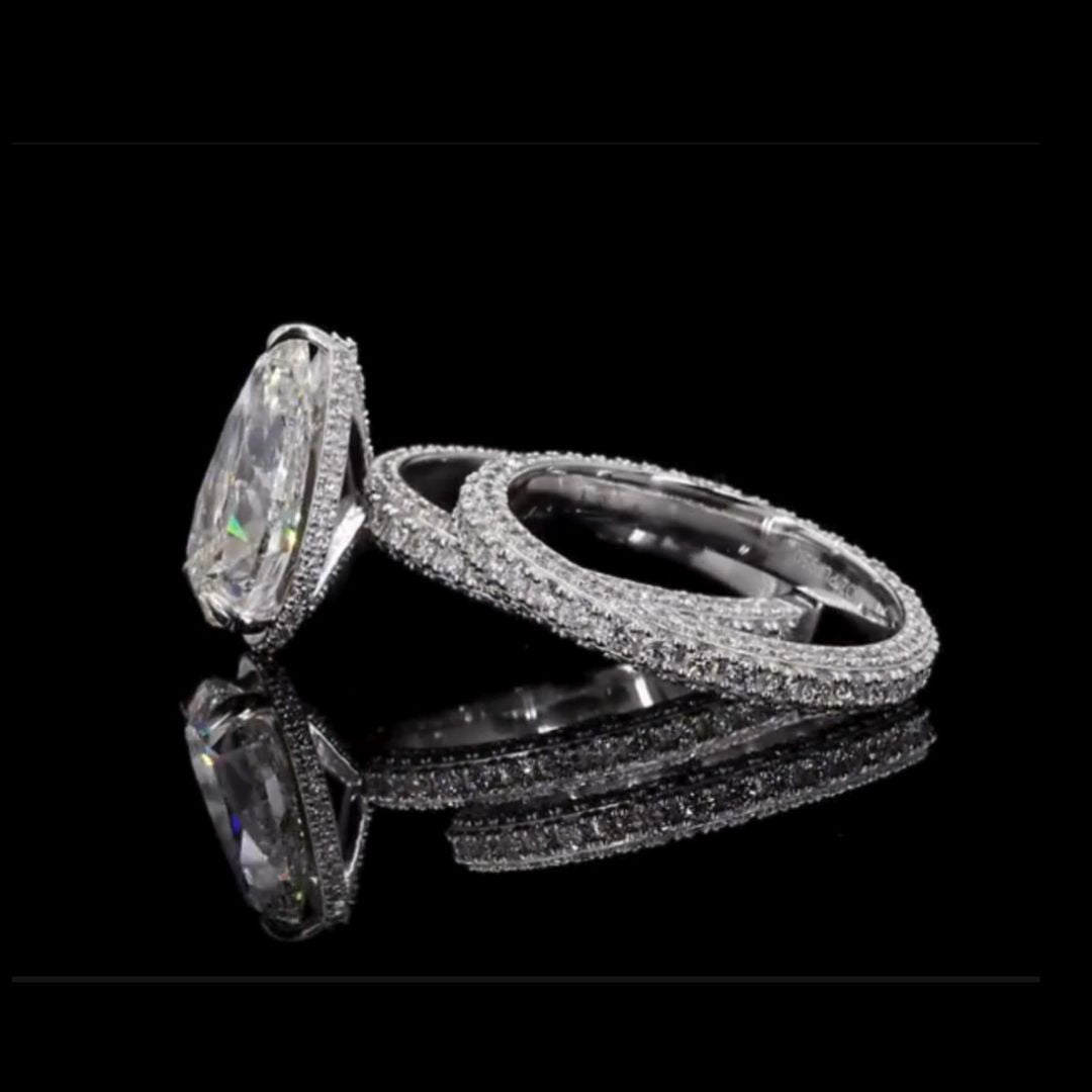 Designed to mesmerize, this masterpiece features a 5.03 CT VVS-EF Pear Solitaire surrounded by scintillating pavΓ© diamonds, paired with a matching diamond band β creating a flawless, luxurious bridal set.