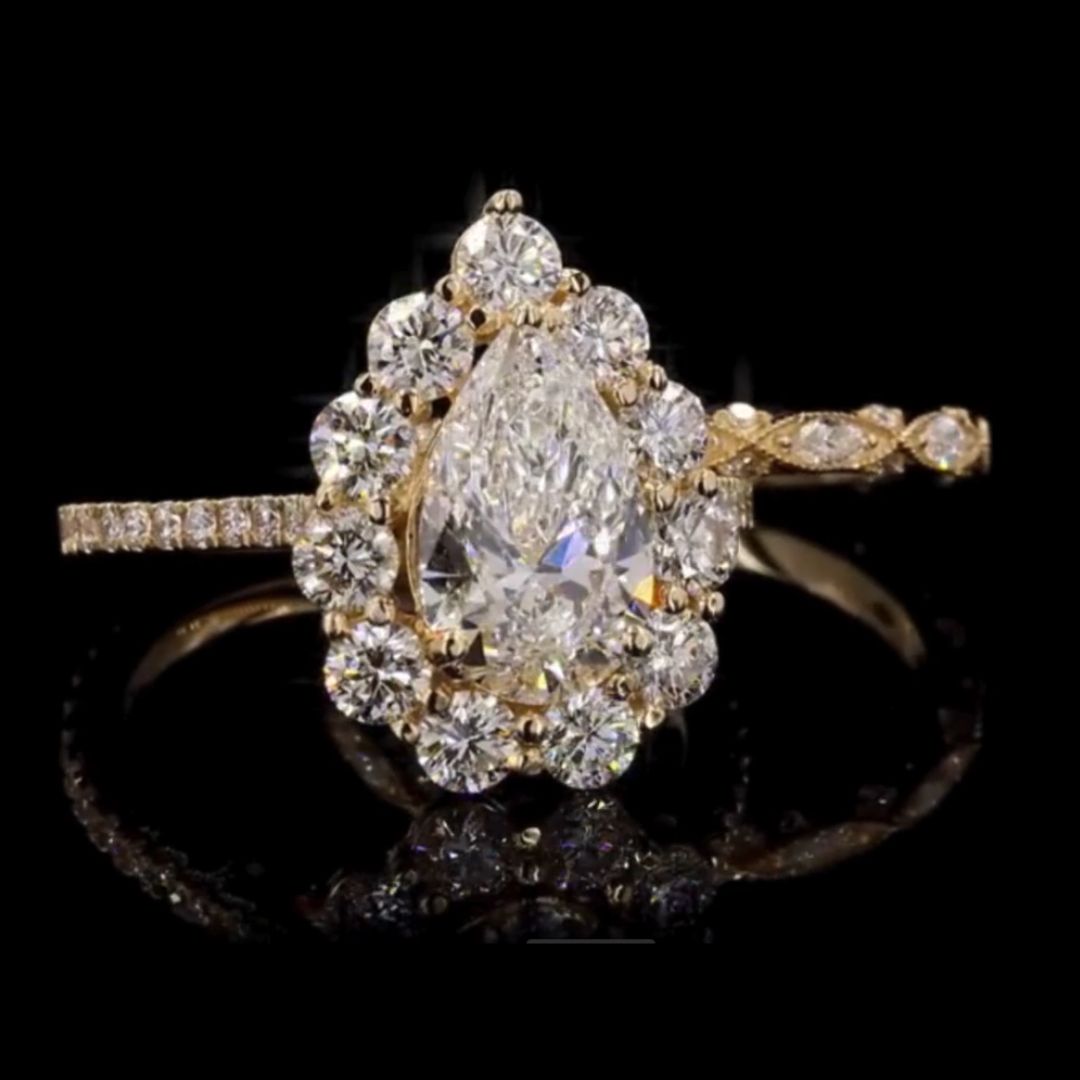 The stunning 2.00 CT VVS-EF Pear Solitaire sits at the center, surrounded by a radiant floral halo of VS-FG diamonds, creating a breathtaking bloom effect that captures light from every angle.