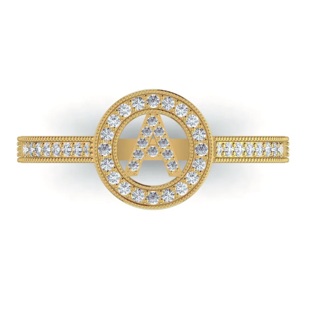 Show your style and identity with this stunning Initial “A” Diamond Ring, beautifully handcrafted by Vinita Jewels. Featuring a circular diamond halo around the alphabet “A,” this elegant design shines in your choice of 9K, 14K, or 18K Gold — perfect for daily wear or gifting your loved ones.