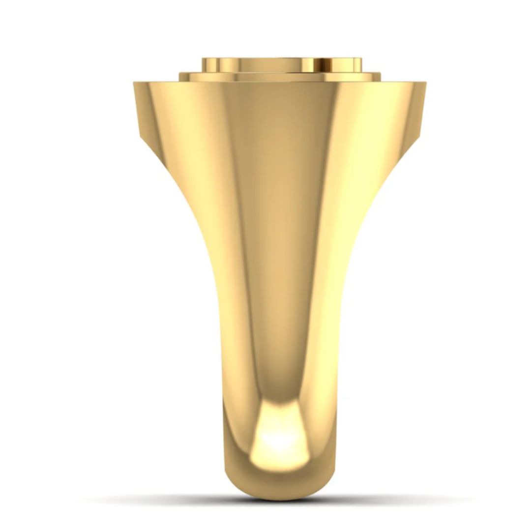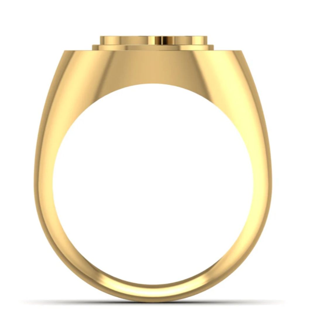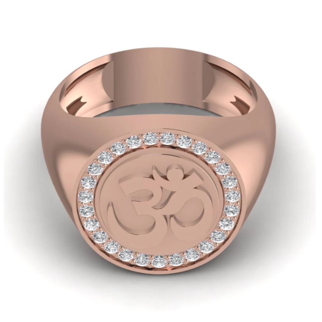 The sacred ‘Om’ symbol is artistically engraved and adorned with shimmering round diamonds, representing harmony between body, mind, and soul. Its bold signet-style design and polished gold finish make it a statement piece for the modern man rooted in tradition.